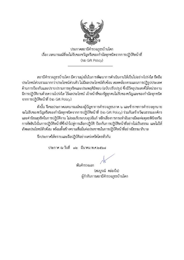 - ประกาศสำนักงานยุทธศาสตร์ตำรวจเรื่องเจตนารมณ์ที่จะไม่รับของขวัญหรือของกำนัลทุกชนิดจากการปฏิบัติหน้าที่